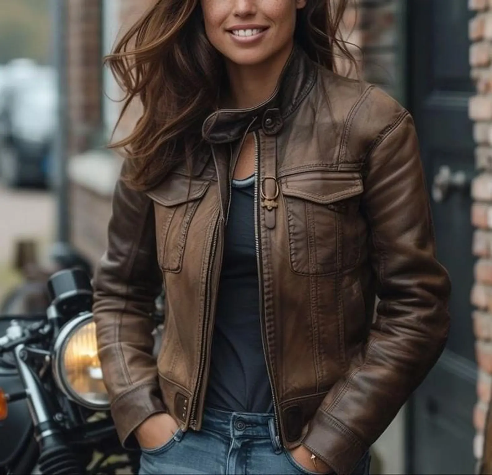 Add a touch of timeless style to your wardrobe with this women’s brown leather motorcycle jacket. Crafted from high-quality genuine leather, this jacket features a vintage distressed finish, classic front pockets, and a comfortable tailored fit. Perfect for layering, it blends rugged biker vibes with everyday wearability.