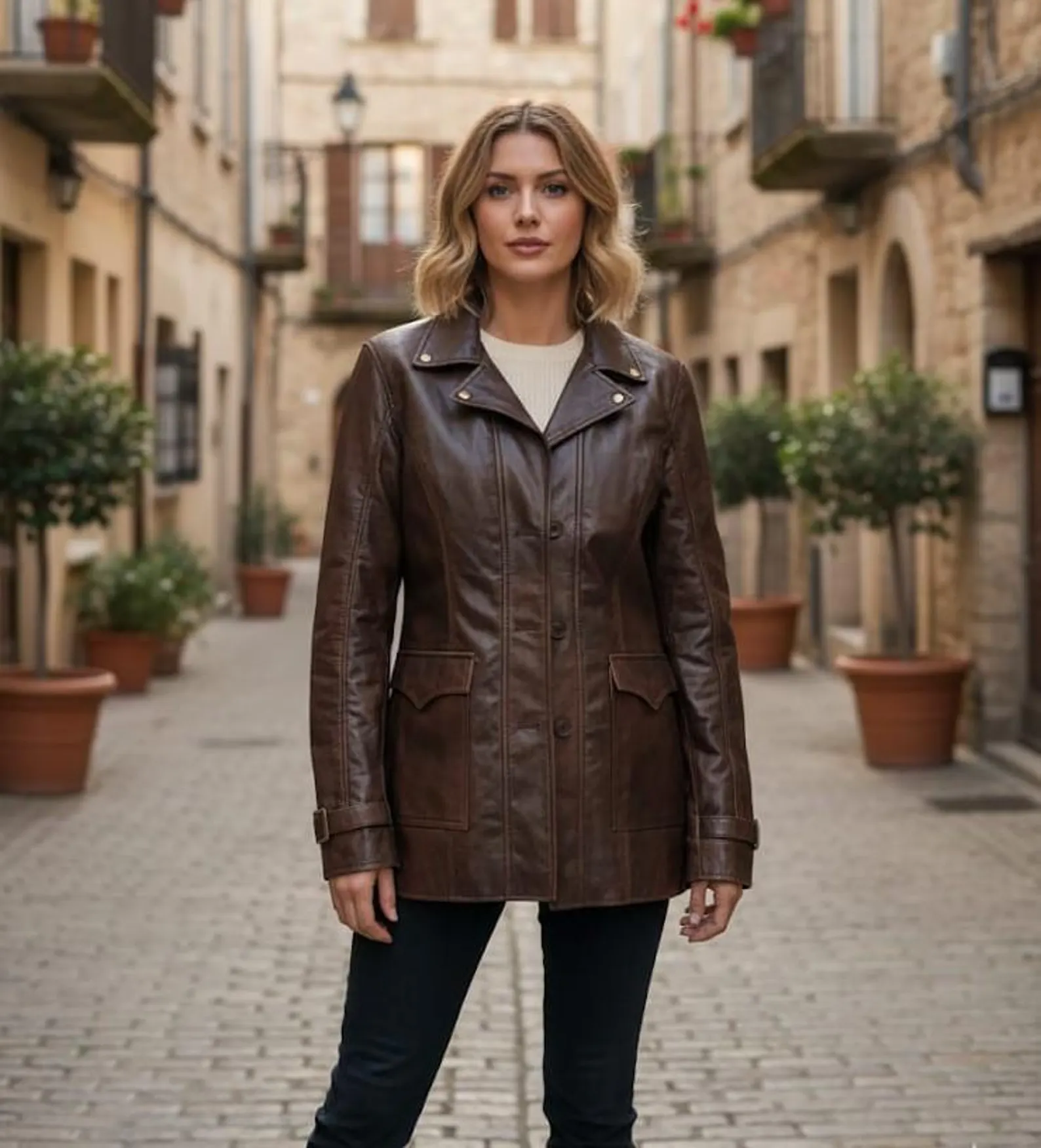 Step into timeless style with this women’s vintage distressed leather coat. Crafted from premium genuine leather, this jacket features a classic long-line design with a naturally aged, worn-in look that gives it unique character and charm. The distressed finish adds vintage appeal, while the tailored cut, button-down closure, and functional pockets make it both stylish and practical.